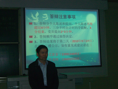 支部书记范新泰同学首先向大家介绍了本次答辩的基本规则与流程,答辩采取候选人利用PPT等形式展示自己,党员提问,最后正式党员无记名投票形式产生新一期的重点培养对象。