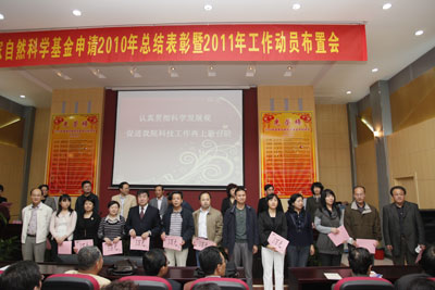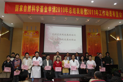 2010年国家自然科学基金总结表彰暨2011年工作布置会于本月23日在院工会多功能厅隆重召开。颜虹校长助理、科研院贾毅华副院长、王文处长及我院党政领导出席大会。会议由科研部何爱丽主任主持,各临床医技科室主任、受表彰人员及部分科技人员200余人参会。