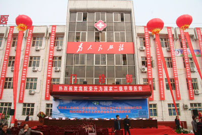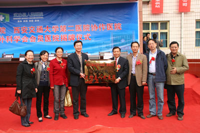 陕西省卫生厅厅长刘少明向武功县人民医院授二甲牌匾,我院高亚副院长与武功县人民医院院长尚宏杰为协作医院揭牌。随后高亚副院长进行讲话,他首先向武功县人民医院表示祝贺,接着介绍了我院的基本情况,指出我院是卫生部直属的综合性三级甲等医院,许多专科在西北乃至全国均有较高的知名度,两家医院协作后,我院将通过免费培训医技护人员、学术讲座、义诊、手术演示等形式,为县医院培养医疗技术人才,提高县医院的医疗技术水平,达到解决当地老百姓看病难、看病贵问题的目的 。