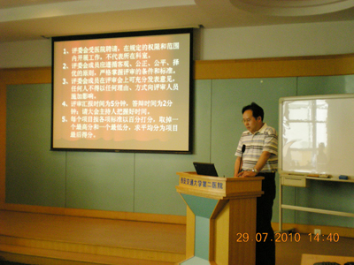 2010年医院医疗新技术立项评审于7月29日下午在讲学厅顺利召开,来自全院各科室的53名申报者参加了答辩。院长贺西京教授、副院长高亚教授、罗金燕教授、秦兆寅教授、杨德昌教授、李国威教授、牛小麟教授、张王刚教授、许珉教授等资深专家担任此次评审的评委,并特别邀请交大一附院吕毅教授担任院外专家评委。