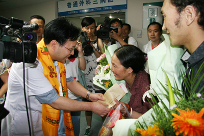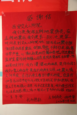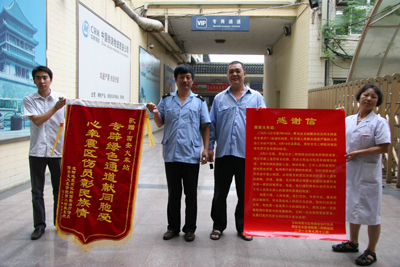患者一家在我院期间,从治疗到生活起居饮食,我院都给予了极大的帮助,将危重患者曲珍从死亡线上拉了回来,为菜东和母亲出院后在医院陪护妹妹给予了极大的方便,又为菜东突发急性阑尾炎及时的进行了手术和治疗,展现了我院医护人员对灾区人民的深切关爱和奉献精神。