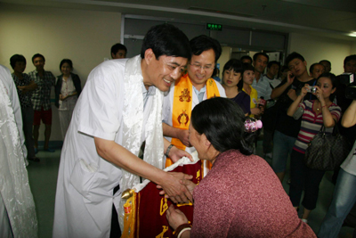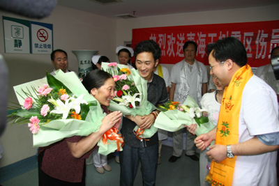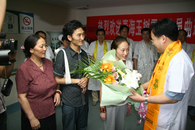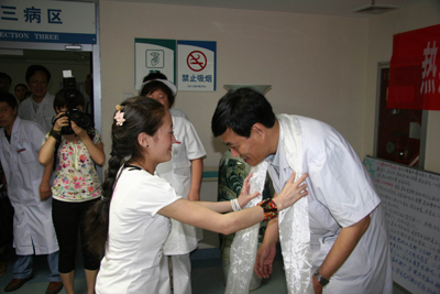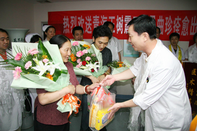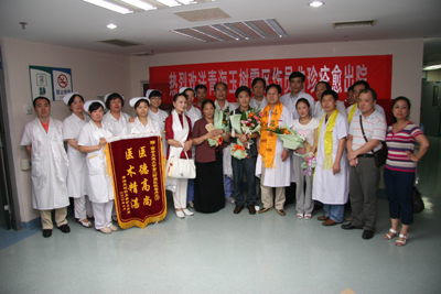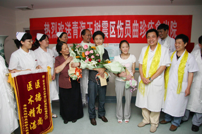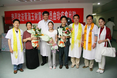 学校和院党政领导班子对曲珍的治疗高度重视,明确指示:以最好的医疗设备、最好的医疗团队(负责曲珍会诊团队为全院各科副高医师以上人员)、最好的药品、最好的服务为灾区患者和曲珍治疗,保全每一位患者及曲珍的生命。各有关科室医务人员对曲珍的治疗倾注了大量的心血,使曲珍的病情转为为安,已经达到出院标准,今天将痊愈出院回家。