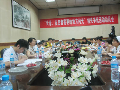 为积极响应院党委和校团委的号召,以党组织开展创先争优活动为契机,牢固树立党建带团建的意识,院团委于7月2日下午在第二会议室组织全院团员青年开展“青春,在患者需要的地方闪光”创先争优活动动员会,团支部书记以上人员参加了会议。