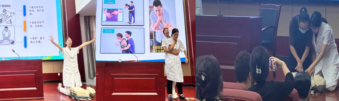 急救讲座环节:吕俊华主治医生首先,深入浅出的讲解了心脏骤停的概念、常见的病因、不及时采取急救措施的严重后果。随后,她分步骤地演示了心肺复苏的操作流程、自动体外除颤器(AED)的获取和具体使用方法。最后,她进一步介绍了异物卡喉所致呼吸困难时的急救方法——海姆立克急救法。