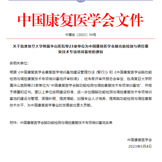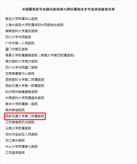 2023年5月4日,根据《中国康复医学会康复医学培训基地建设管理办法》和《中国康复医学会脑功能检测与调控康复技术专项培训基地评审标准》,经专家评审并报中国康复医学会审定,西安交通大学第二附属医院获批为“中国康复医学会脑功能检测与调控康复技术专项培训基地”,成为全国获批该基地的23家医院之一。该基地由西安交通大学第二附属医院康复医学科申报,紧密结合目前脑功能检测与调控康复技术培训的需求,受中国康复医学会统一部署,旨在加强及推广脑功能检测与调控康复技术,加强专业人才培养,提高脑功能检测与调控康复技术水平。