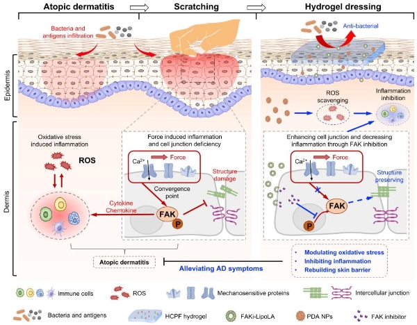 近日,西安交通大学生命科学院与技术学院仿生工程与生物力学研究所(BEBC)与二附院皮肤科耿松梅教授团队合作,基于力学、材料学、皮肤病学等多学科交叉开发了一种多功能水凝胶皮肤敷料,首次实现了力-化协同治疗特应性皮炎。该工作以“集成FAK抑制和ROS清除功能的水凝胶敷料用于特应性皮炎的力-化协同治疗” (Hydrogel dressing integrating FAK inhibition and ROS scavenging for mechano-chemical treatment of atopic dermatitis)为题,在《自然·通讯》(Nature Communications)上在线发表。