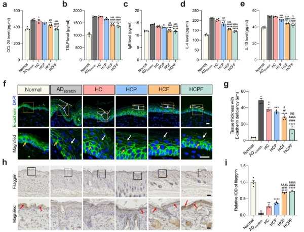 该工作证明了力学信号通路关键蛋白黏着斑激酶(Focal adhesion kinase, FAK)磷酸化的增强与搔抓有关。在AD小鼠模型中,力学搔抓不仅加重了AD症状,同时增强了组织中磷酸化FAK的水平。随后,团队开发了一种基于硼酸酯的粘性、可拉伸、可自愈的多功能水凝胶敷料(HCPF),负载了用于清除活性氧的聚多巴胺纳米颗粒(PDA NPs)和脂质体装载的FAK抑制剂(FAKi-lipo)以协同治疗AD。这种具有自愈性和抗菌性的水凝胶适用于AD皮肤独特的搔抓和细菌环境。在细胞水平上,通过抑制FAK阻断细胞力学信号转导可以有效减少大应变拉伸导致的炎症因子分泌以及细胞间连接关键蛋白E-Cadherin的破坏。在动物水平上,FAK抑制可以减少搔抓下皮肤屏障的破损以及皮肤的炎症水平。整合FAK抑制和ROS清除的HCPF水凝胶敷料以力-化协同的方式取得了最佳的AD治疗效果。