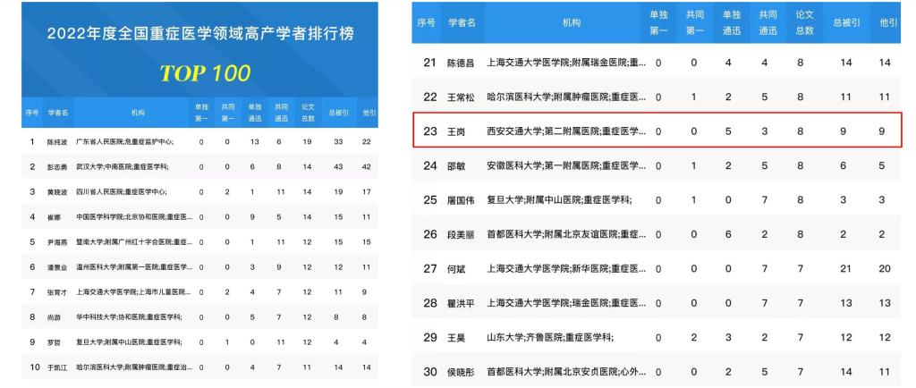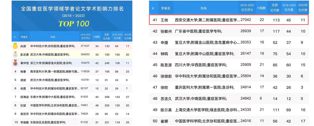 4月20日,北京同舟云网络信息技术有限公司发布了2022年度全国重症医学领域高产学者百强榜单,我院重症医学科副主任王岗教授位列全国第23位。该公司也同期发布了全国重症医学领域学者论文学术影响力(2018-2022)百强排名榜单,王岗教授名列全国第41位,为西北地区重症医学领域唯一入选专家。