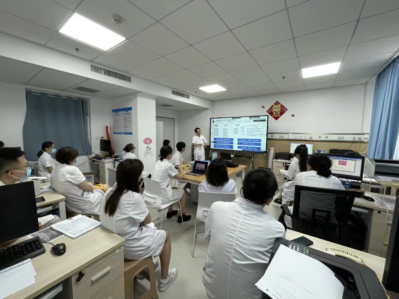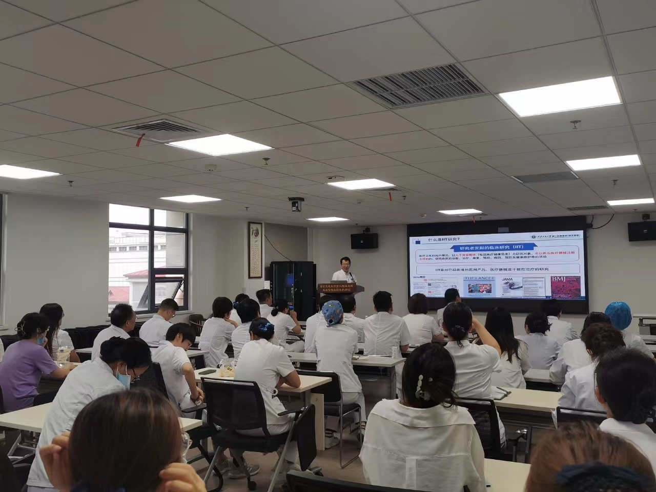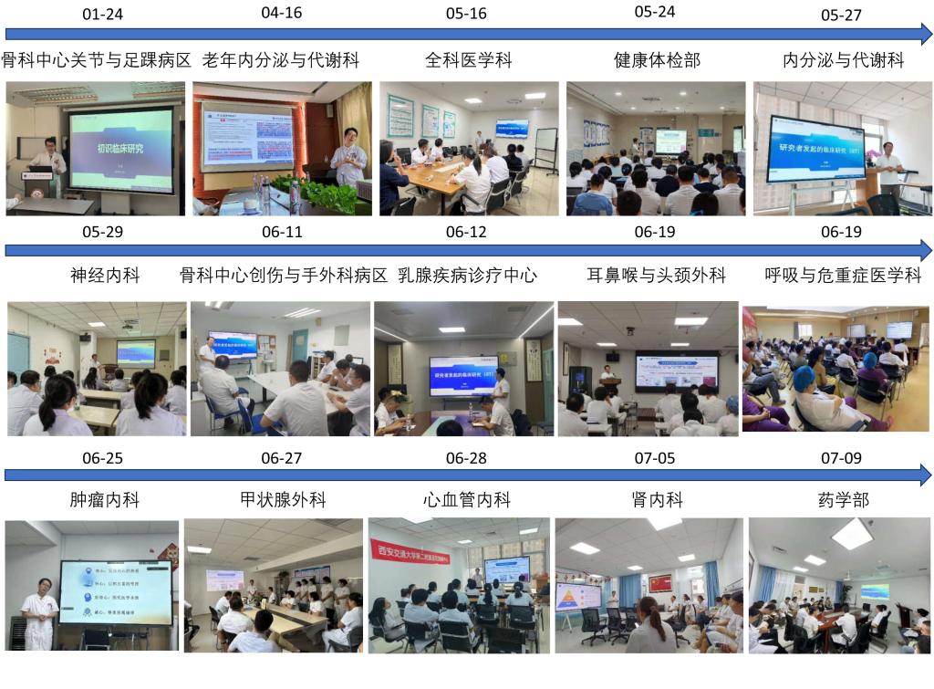 从2024年1月24日开始,临床研究项目马瑞副主任从自己所在的骨科中心关节与足踝病区试行宣讲,反响良好。后在2024年4月16日于老年内分泌与代谢科再次试行宣讲,确定了宣讲的形式和内容框架。随后在今年5月全面开启IIT下科室宣讲工作,现已走过包括骨科中心关节与足踝病区、老年内分泌与代谢科、全科医学科、健康体检部、内分泌与代谢科、神经内科、骨科中心创伤与手外科病区、乳腺疾病诊疗中心、耳鼻喉与头颈外科、呼吸与危重症医学科、肿瘤内科、甲状腺外科、心血管内科、肾内科和药学部共计15个临床医技科室,总共培训医护人员超过500人次,反响良好,反应热烈。