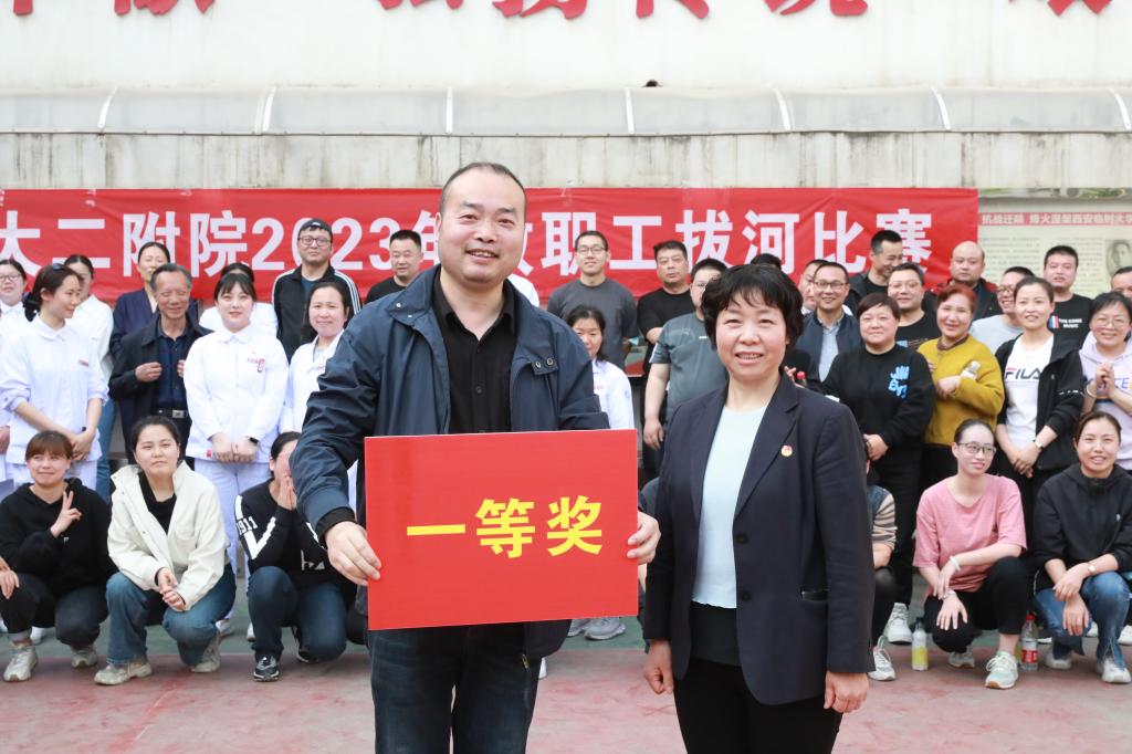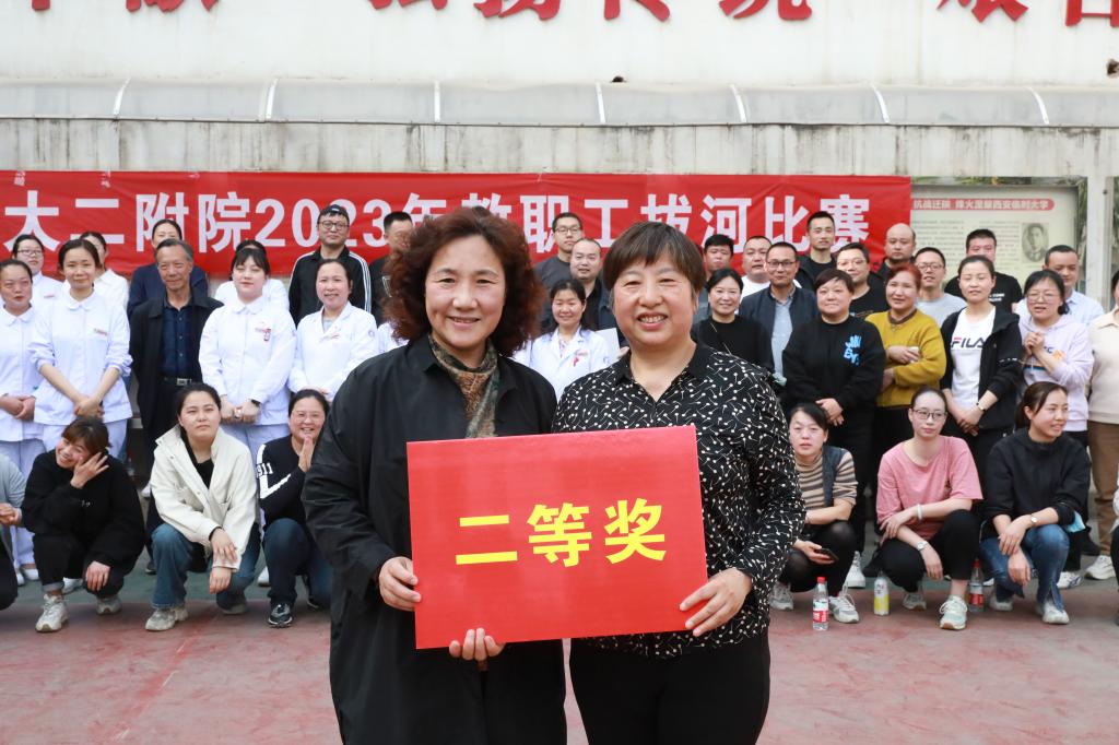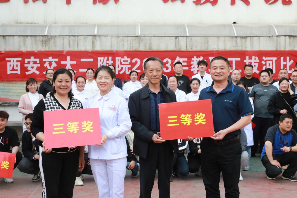 4月11日下午,交大二附院2023年春季教职工拔河比赛在南院操场火热开赛。全院十四个部门工会共计200余名教职工参加比赛,经过两天四轮13场单淘汰赛,第十二部门工会荣获本场比赛冠军,第七部门工会获得亚军,第四部门工会与第九部门工会荣获季军。