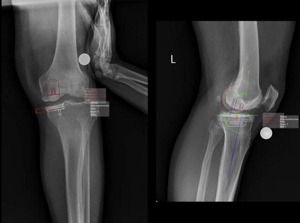 王伟教授使用mediCAD术前规划软件向中心医院骨科团队展示了系统、全面的术前规划操作及要点。mediCAD可根据患者的个体病变差异,测量、收集关键数据,评估关节病变情况,提高假体选择的准确性,减少了手术后阶段的修正。例如在进行膝关节单髁置换术术前规划时,mediCAD使用"膝关节"模块在两个平面(AP和ML)上规划,计算出预期的术后机械轴、纵轴和所有相关的角度,潜在的轴向错位可以在规划过程中被确定和纠正,使得术前和术后可以评估对整个腿部力量传递的修正,这反过来又大大延长了假体膝关节的使用寿命。目前,在王伟教授的指导下,中心医院骨科团队正全面熟悉mediCAD软件的应用,根据这些术前标准规划文件,病例讨论、术前规划的有效性、技术性都得到了提高,手术疗效得到了更好的提升。