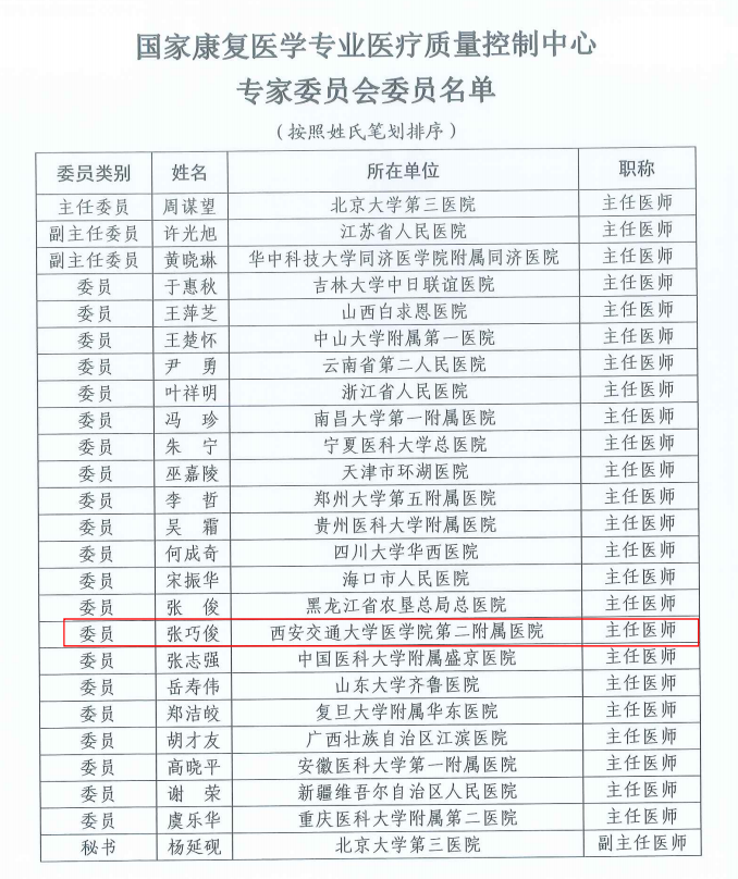 张巧俊,教授/一级主任医师,康复医学科主任。陕西省康复医学质控中心主任,中国康复医学会吞咽障碍康复专业委员会主任委员,中国康复医学会标准委员会常委,中国康复医学会质量控制工作委员会委员,中华医学会物理医学与康复学分会委员;中国医师协会康复医师分会常务委员;抗衰老促进会康复分会副会长,陕西省康复医学会会长,陕西省医学会物理医学与康复医学分会主任委员。张巧俊教授作为国家康复医学专业医疗质量控制中心专家委员会委员、陕西省康复医学质量控制中心主任,近年来,指导省内多地区成立市级康复医学质控中心,以点带面督促地市区加强康复医学工作,助力关键技术走进基层,提升基层康复诊疗能力;组织省内各地市质控中心专家修订“陕西省康复医学质量管理指南(讨论稿)”、“陕西省康复医学质控手册(草稿)”,为陕西省内各级医院康复医学学科建设与发展做出了卓越贡献。