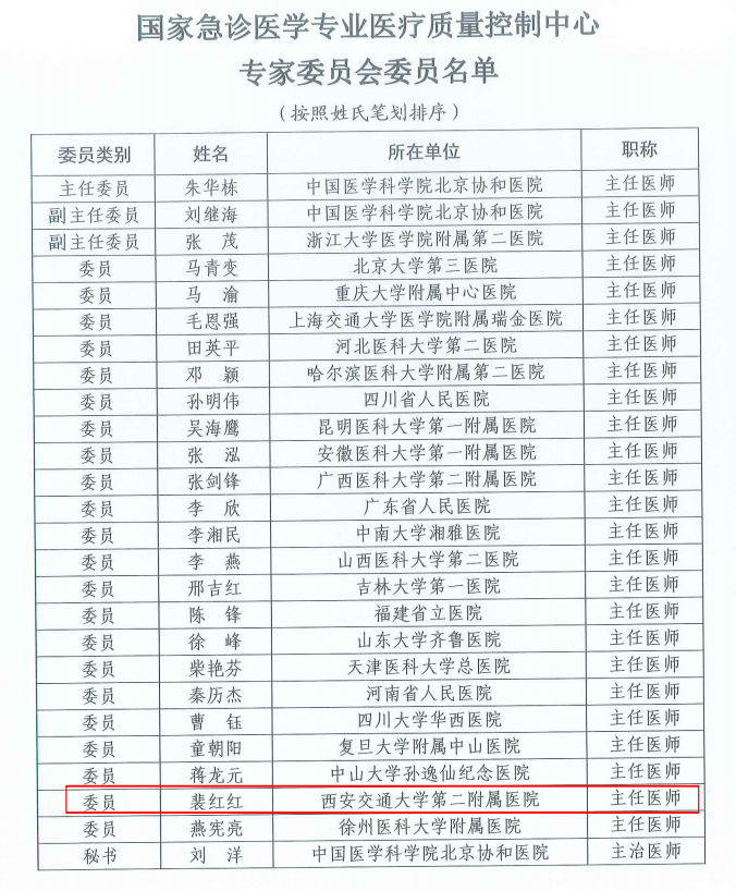 裴红红,教授/主任医师,急诊科、急诊ICU主任。陕西省急诊医学质量控制中心主任,中华医学会急诊医学分会青年委员,中华医学会急诊医学分会灾难学组成员,中华医学会急诊医学分会创伤学组成员,中国医学救援协会灾害救援分会第一届理事会理事,中国医学救援协会急诊分会第一届委员会委员,陕西医学会急诊医学分会委员,陕西医学会院前急救分会第二届委员会委员,西安医学会急诊医学分会主任委员,西安医学会医疗事故鉴定委员会专家组成员,《中华急诊医学杂志》编委。裴红红教授作为国家急诊医学专业医疗质量控制中心专家委员会委员、陕西省急诊医学质量控制中心主任,积极组织省市级急诊质控中心的交流与学习,举办急诊质控工作会议,联合各地市质控中心共同促进陕西急诊医学学科建设更好的发展。同时开展急诊质控下沉帮扶,助力陕西急诊医学事业健康向上发展;举办陕西省急诊核心技术培训项目,助力关键技术走进基层,提升基层医疗救治能力;组织省内各地市质控中心专家修订并颁布了《陕西省医疗质量工作手册(急诊医学分册)》,为陕西省内各级医院急诊医学学科建设与发展提供了有力指导。
