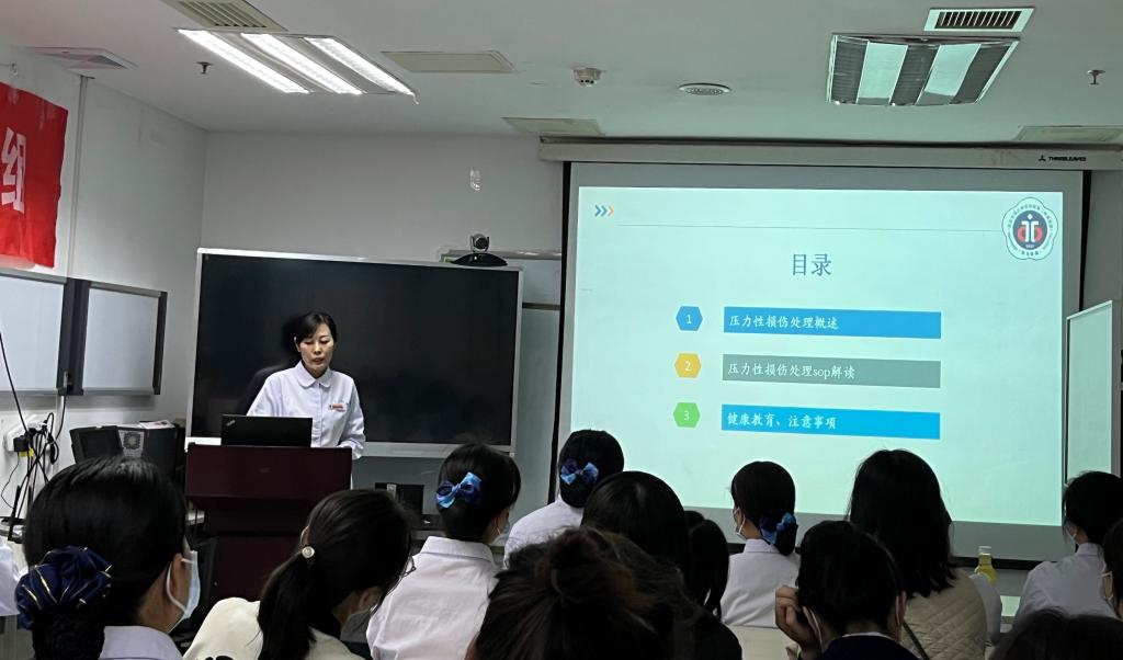 接下来,交大二附院压疮伤口造口专科小组王金娟组长汇报了2022年压力性损伤专项检查的结果,对存在的问题进行详尽具体的汇总分析,指出改进措施和努力的方向。干部病房王园副护士长和妇产科万秋园副护士长分别就《压力性损伤管理临床指引》和《交大二附院压力性损伤处理SOP》进行了培训,内容涵盖最新定义与分期、压力性损伤发生的原因与好发部位、压力性损伤评估与预防、各期压力性损伤的处理及伤口敷料的选择等几个方面,图文并茂,内容结合临床深入浅出,使大家受益匪浅。