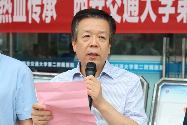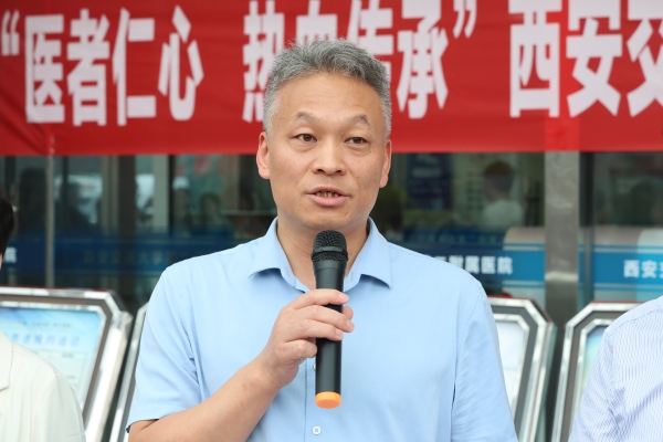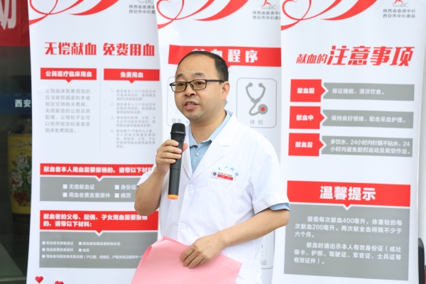 7月9日上午,无偿献血月活动启动仪式在门诊综合楼前正式举行,仪式由医务部常务副主任王虎清主持。西安市中心血站站长、党委副书记马超峰、副院长张蓬勃、党委副书记党变玲、工会主席陈海文、宣传部部长买秋霞、工会主任张海英、团委书记董艳、医务部副主任同艳妮、输血科副主任董艳迎出席启动仪式。