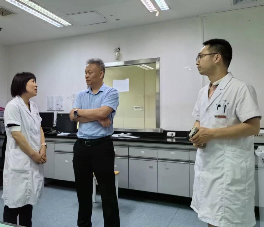 7月9日上午,西安交通大学第二附属医院无偿献血活动启动仪式完成之后,陕西省血液中心西安市中心血站站长马超锋、业务二科副主任裴静、血型研究一室副主任褚晓月等一行三人来到我院输血科,与输血科副主任董艳迎及工作人员就当前的临床用血、供血情况进行了交流探讨。