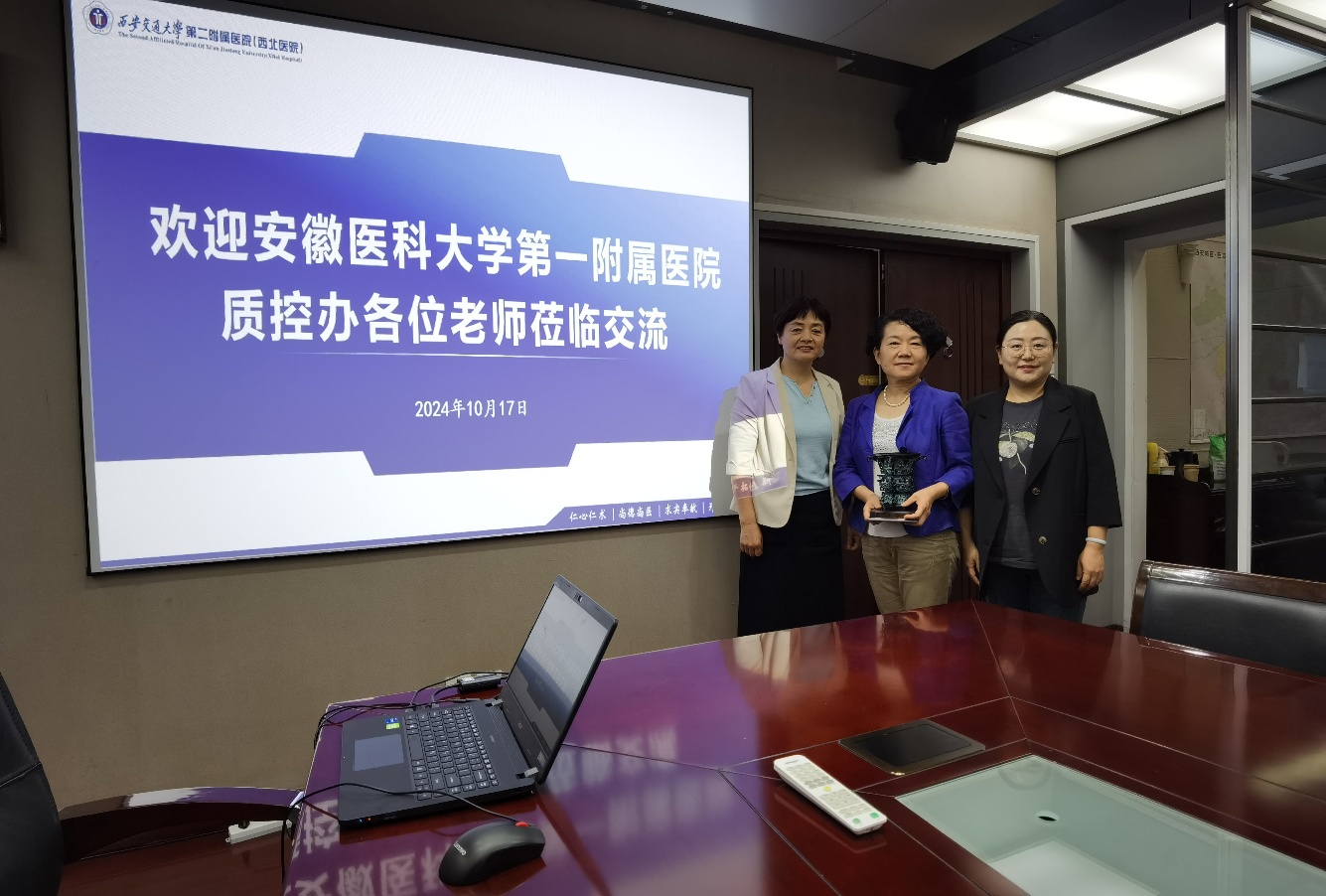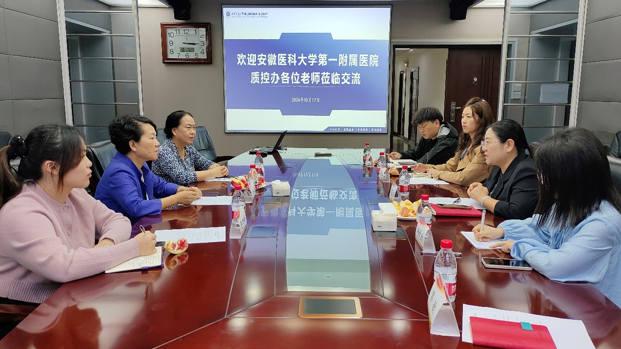 2024年10月17日,安徽医科大学第一附属医院医疗质量控制办公室的马红秋主任和李祎婷干事赴我院进行参观交流,并与国家卫健委医疗机构感染防控专家委员会委员、陕西省预防医学会医院感染控制专业委员会主委索瑶,医务部医疗质量控制办公室的寇惠娟副主任、病案与医疗信息管理办公室的李明副主任,以及质控办和国考办和工作人员进行了座谈。