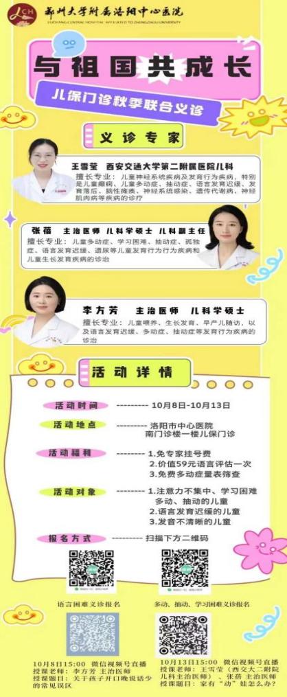 10月13日是国庆长假后的第一个周末,我院驻洛阳市中心医院的儿科的王雪莹医生,联合儿保科负责人张蓓,在我院儿科杨琳主任和洛阳市中心医院儿科孙永法主任的大力支持下,于上午8点至下午1点在洛阳市中心医院开展了义诊活动,受到了患者的高度评价。 此次义诊活动旨在为当地儿童提供专业的医疗咨询和健康检查。王雪莹医生和张蓓医生凭借其丰富的临床经验和专业知识,为前来就诊的儿童提供了细致的诊断和治疗建议。义诊活动持续了5个小时,直到下午1点才结束,体现了她们对患者健康的深切关怀和高度责任感。