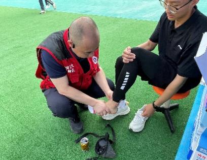 据不完全统计,他们累计为超过百名学生提供了快速且高效的医疗救助。这些学生所遭受的损伤涵盖了中暑、呼吸性碱中毒、擦伤、扭伤等多种常见的运动伤害。面对每一位受伤的学生,医疗保障团队的成员们都展现出了一丝不苟的工作态度。他们能够迅速而精准地诊断伤情,进而采取科学合理的治疗方案,为受伤学生提供及时、恰当的救治。在救助过程中,他们扎实的专业能力发挥了关键作用。面对中暑的学生,他们迅速展开紧急降温处理;遇到呼吸性碱中毒的学生,他们耐心安抚并给予正确引导;对于各类外伤,他们则细致入微地进行清创和包扎。当运动员们发生急性韧带撕裂时,他们第一时间沟通交大二附院运动医学科及超声医学科,及时转诊救治,受到家长们的高度赞扬。在运动会医疗保障期间,他们将每一个环节都处理得井井有条、精准无误。他们的专业表现不仅让受伤学生的身体得到了及时有效的治疗,更在他们的心灵深处注入了温暖与安慰。