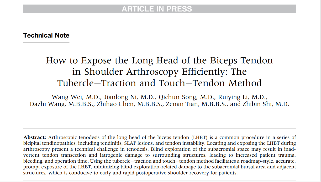 2024年9月5日,我院骨科中心-运动医学科时志斌教授、倪建龙副教授团队原创手术技术在骨科运动医学领域顶刊《Arthroscopy: The Journal of Arthroscopic and Related Surgery》旗下手术技术类期刊《Arthroscopy Techniques》正式发表,首次介绍了肩关节镜手术时在肩峰下间隙如何快速精准寻找并显露肱二头肌长头腱,相关手术视频及文章已可在PubMed及期刊网站上公开下载,这是本团队继今年5月22日发表肩关节脱位治疗新技术后,再次发表技术类文章,这代表我院运动医学团队在肩关节镜手术技术方面已达国际先进水平,并有望将此技术在世界范围内推广普及。