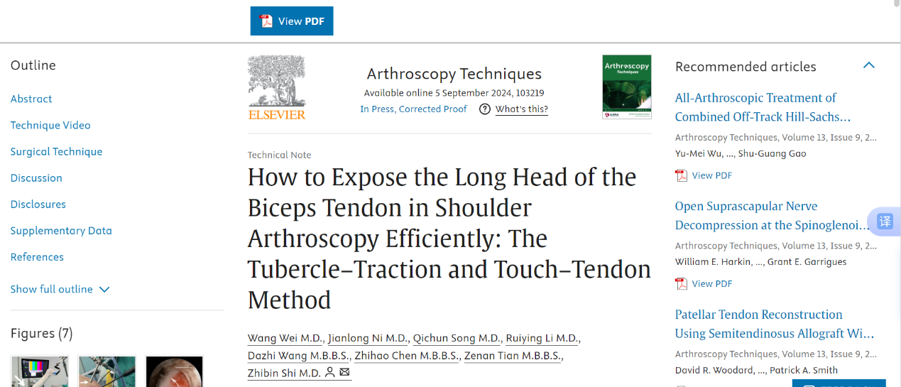 文章信息:Wang Wei, Jianlong Ni, Qichun Song, Ruiying Li, Dazhi Wang, Zhihao Chen, Zenan Tian,Zhibin Shi.Arthroscopy Techniques,Received 24 May 2024, Accepted 18 July 2024, Available online 5 September 2024,https://doi.org/10.1016/j.eats.2024.103219.