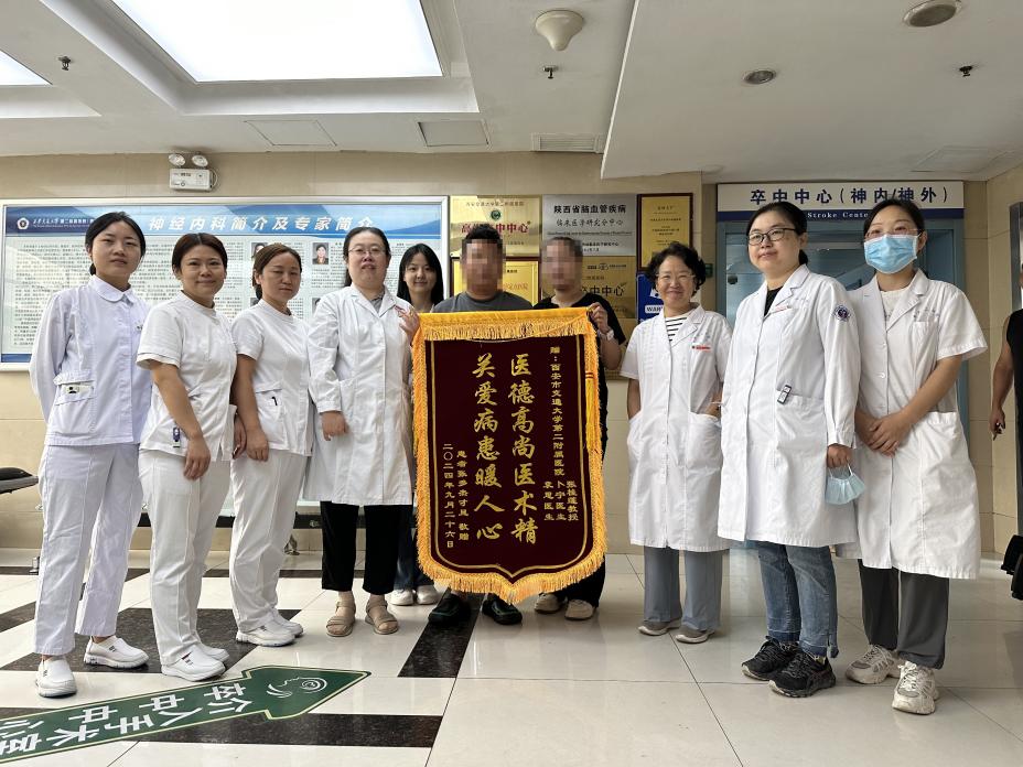 考虑到患者是少数民族,一方面病情危重,另一方面需尊重少数民族宗教信仰。在此特殊情况下,卜宁副主任向患者家属介绍了我院神经免疫亚专业目前开展的新疗法 —— 新生儿受体(FcRn)拮抗剂。该疗法可以清除致病性IgG抗体,在神经免疫疾病治疗方面具有独特优势和显著疗效。经患者及家属知情同意后,为其输注新型生物制剂艾加莫德,输注过程十分顺利。在生物制剂输注第一天,患者病情不再进展,自我感觉气短症状减轻;从第二天起,患者四肢肌力逐渐恢复,可抬离床面;到第七天,患者已能独立在病房行走及如厕。短短一周内,病情实现逆转,让患者重获新生。患者妻子为表达感激之情,特意在青海定制精美锦旗,不远千里奔赴西安赠予神经内科二病区医护团队。