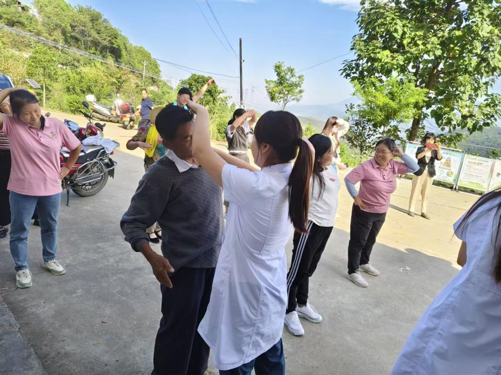 王蓉主任护师及刘丹主管护师为群众演示心脏康复操,得到了群众们的追捧,纷纷参与其中。与此同时各位医护人员还为前来义诊咨询的患者免费测量血压、测血糖和健康咨询,耐心地询问居民的日常身体状况、饮食习惯、睡眠状况等,为群众答疑解惑,针对群众生活中的常见病、慢性病,提供诊疗、合理用药和健康饮食指导,为群众提供面对面、零距离、多样式的健康配送服务赢得了乡亲们的一致好评和感谢。