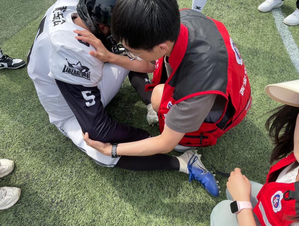 在橄榄球比赛中,两支队伍均展现了高水平的竞技状态,运动医学科在比赛现场部署了完备的医疗团队和应急设备。宋继东医师及徐维佳、郑梦桃护士迅速响应场上的各种突发状况,确保受伤或出现脱水症状的运动员得到及时救治。比赛中,由于双方运动员奋力拼搏,出现了包括急性肩关节脱位在内的几起伤病情况。得益于运动医学科的专业救治和全程监控,所有运动员均得到了妥善处理,保证了比赛的顺利进行。