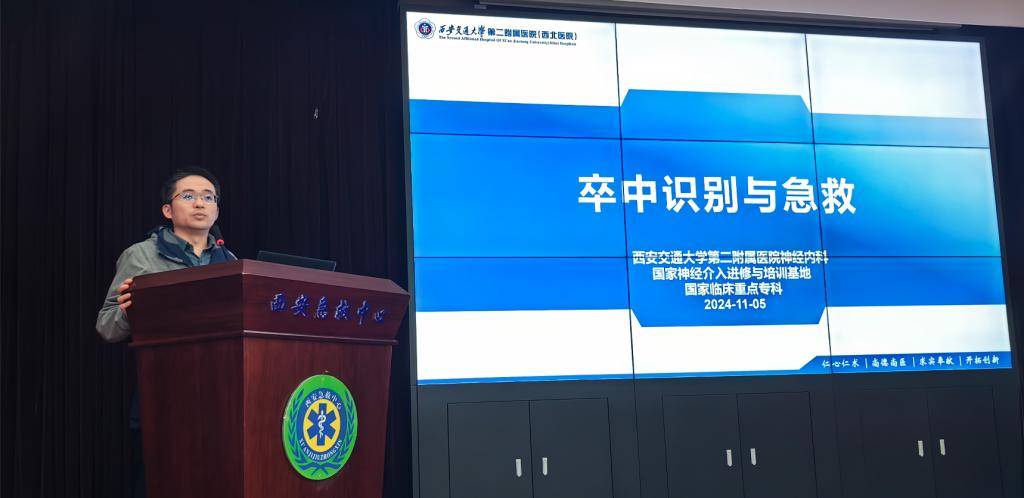 当天正值西安急救中心月度急救网络质控会议,神经内科副主任樊洪教授应邀在会议现场作《卒中识别与急救》专题讲座,重点介绍了急性脑卒中的识别、院前转运及急诊救治时间窗等要点。随后,神经内科主任展淑琴教授作总结发言。