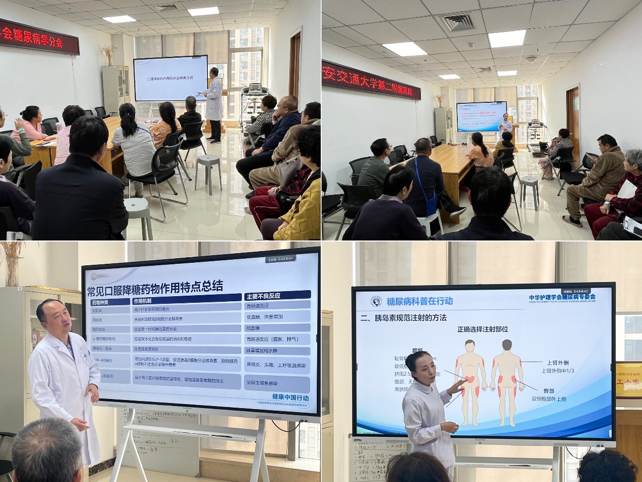 10月25日下午,我科于大明宫院区内分泌代谢科学习室举办了糖尿病科普讲座。董鹏教授为糖友们生动形象地讲解了“常见控糖药物的作用特点”。张琳副护士长为糖友们讲解了“胰岛素的规范注射”,她用通俗易懂的语言,教糖友们如何正确使用胰岛素。对于患者们提出的疑惑,董鹏教授和张琳副护士长细致入微地进行讲解和示范。讲座结束后,大家积极地参与提问,现场气氛热烈。