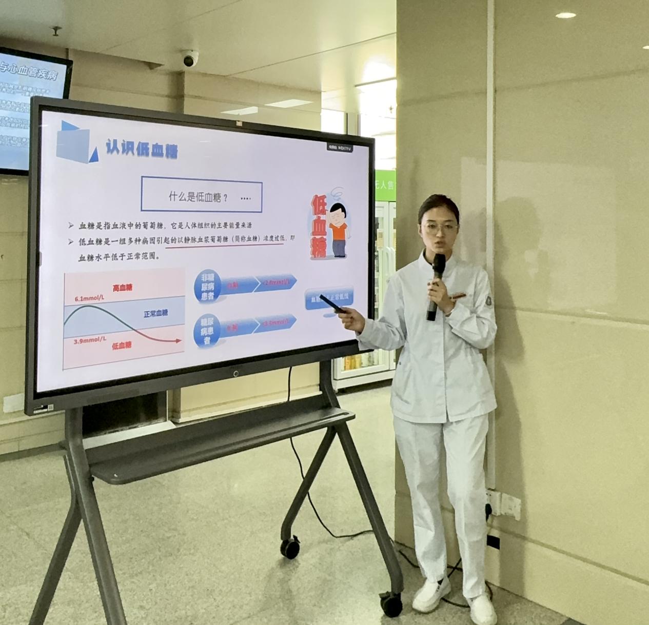为了提升公众对低血糖的认识,强化预防与治疗意识,确保人民群众的生命安全和健康,10月30日,我们在综合楼三楼候诊区举办了一场以“低血糖的防治”为主题的健康科普活动。本次活动的主讲人是门诊部的李洁护师。