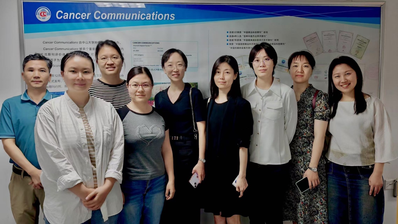中山大学肿瘤防治中心主办英文学术期刊 Cancer Communications(《癌症通讯》杂志),多次入选"百种中国杰出学术期刊"和"中国最具国际影响力学术期刊";2014年被SCI收录,目前影响因子20.1(JCR 2023),在JCR 肿瘤学分类中位于Q1区,在亚洲综合肿瘤学领域学术期刊中排名第一。22日下午,在学科建设办公室王红梅主任带领下我院一行参访Cancer Communications编辑部,与主编及相关骨干人员关于如何创办高质量期刊等进行深入交流。