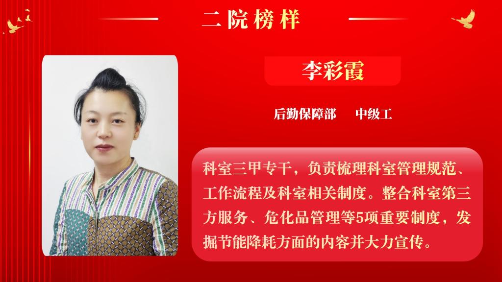 为营造全院将比学赶超融入实际工作,以奋发有为、积极进取的精神面貌迈向新征程,以“二院榜样”评选为契机,以榜样引领促进全面进步。10月28日下午,院工会在南院多功能厅举行了2024年“二院榜样”9月月度人物表彰大会,大会由党委副书记党变玲主持。