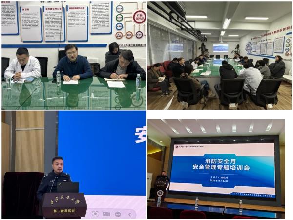 强化责任担当,突出宣传成效。医院安委会召开平安医院建设暨安全生产专题会,积极部署消防月活动,副院长戴一强调医院安全重于泰山,要求各部门严格落实消防安全责任,积极推进消防月各项工作有序开展。期间特邀请西安交通大学保卫处消防专家顾晓鸣老师为医院安委会相关科室人员集中培训消防安全知识,重点从北京长峰医院重大火灾案例分析、在建工地安全管理、施工动火注意事项等方面进行详细讲解。按照医院消防月活动方案,保卫部组织安保人员在医疗区面向患者和职工开展防火宣教;利用医院安全生产微信群、医院安全培训工作群、保卫部微信公众号、LED屏电子媒介等多形式多渠道推送安全知识;在医疗区和家属区醒目位置设置宣传栏、悬挂横幅标语、摆放防火知识展板、防火手册、器材设备等,在全院营造良好的消防安全舆论宣传氛围。
