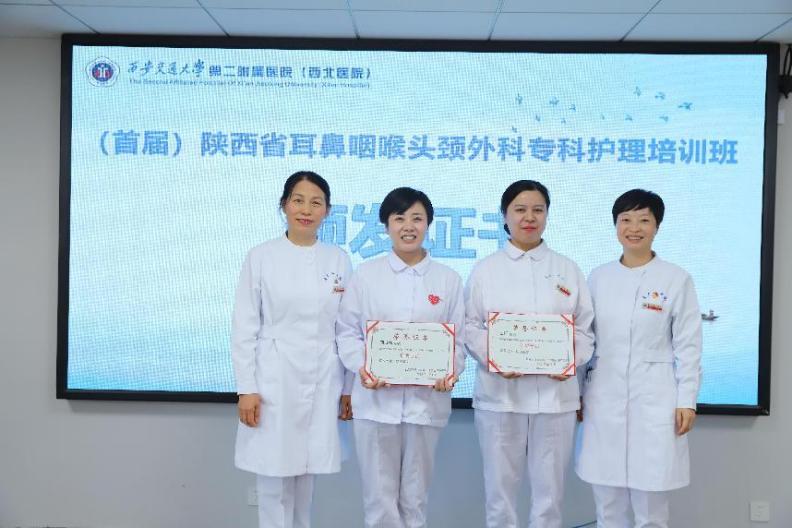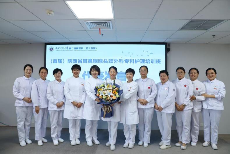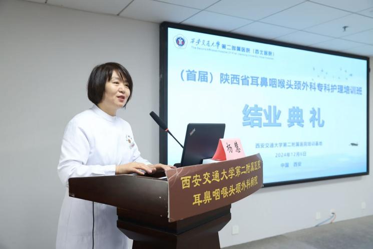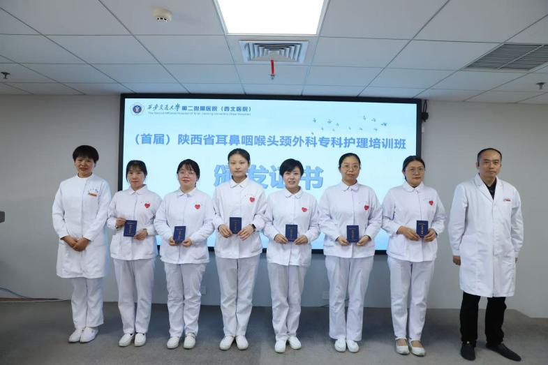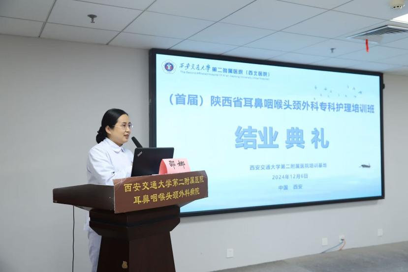 本次培训班在陕西省卫健委的领导下,院领导、护理部及基地培训团队的共同努力下,来自省内外19名学员,经过为期两个月的理论授课及临床实践培训,均以优异的成绩顺利结业。西安交通大学第二附属医院护理部孔德玲副主任、姚聪副主任,耳鼻咽喉头颈外科病院任晓勇主任、孙斌副主任、胡娟副主任、杨慧护士长、杜小滢副护士长、邵娜副护士长、培训班全体带教老师及全体学员共同参加结业典礼。本次结业典礼由邵娜副护士长主持。