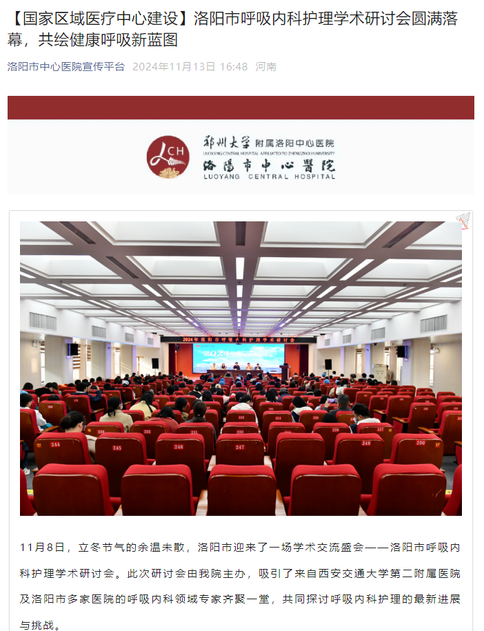 2、主题为“呼吸与共,生命同行,共筑健康呼吸的未来”的洛阳市2024年呼吸内科护理学术研讨会,特邀西安交通大学第二附属医院呼吸内科护理专家周淑如授课;会议围绕成人机械通气患者俯卧位护理、护理交接班管理与实践优化、呼吸康复的落地实施等热点议题展开深入讨论;洛阳市各级各类医疗机构护理人员300余人参会学习。