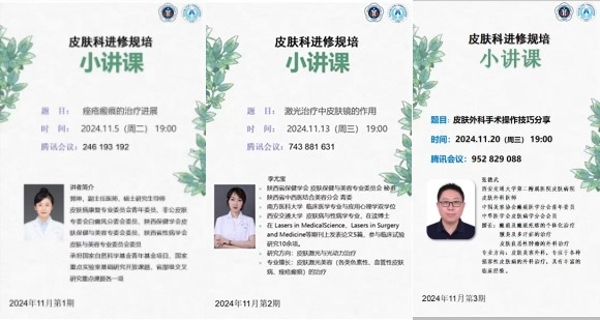 5.西交大二附院线上讲课,分享痤疮瘢痕的治疗进展、激光治疗中皮肤镜的作用、皮肤外科手术操作技巧分享等课程,对皮肤科前沿的治疗理念与方法进行学习交流;每周三进行英语文献晨读,激发创新灵感,拓宽科研思路。