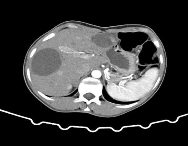 近期阿里地区人民医院收治一名28岁女性患者,体重40Kg,身高140cm,BMI20。以“体检发现肝包虫5年,肝区疼痛1年”之主诉入院。入院后完善B超及上腹部增强CT:肝脏S3段见大小8×7cm囊性病灶,S6、7段见大小约9×8cm 囊性病灶,诊断肝囊型包虫病(CE₃型)。我院援藏队员张立、何鑫、李洪亮及蔡艳组织MDT讨论,制定手术计划,考虑到患者年轻,肝脏体积小,药物作用慢,为防止包虫复发,及术后胆漏合并感染问题,决定采用外囊完整切除的根治性治疗。