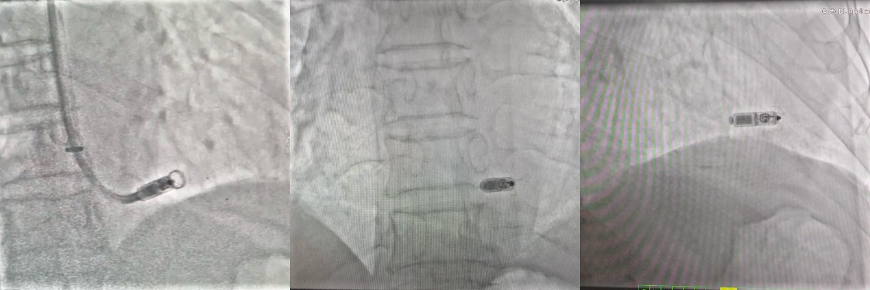 7月6日下午,经超声引导下颈内静脉穿刺成功后,手术正式开始。由于颈内静脉更直,送入递送系统过程中有系统头端压力过大的风险。为避免此风险,需在术中全程X线透视并保持递送系统处于弯曲状态,采用多角度X线透视以确保起搏器始终处于间隔位置。顺利进入27Fr的传送鞘管后起搏器于间隔部位释放成功,参数满意。