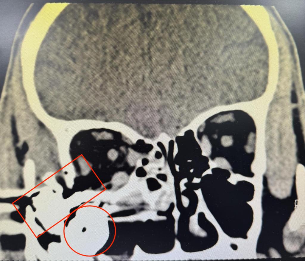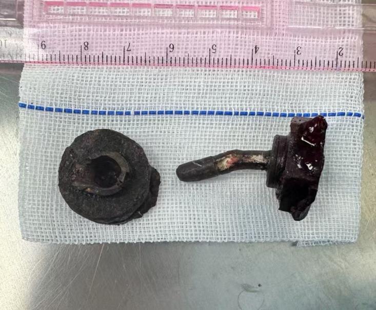 术后给予患者抗感染治疗的同时,刘子瑶副教授反复观察CT影像,考虑如此巨大的金属异物是如何进入眼眶和上颌窦的,又该如何在最小损伤的情况下将其取出呢。经与耳鼻喉科共同商议,异物取出手术定在5天后两科共同协作完成,耳鼻喉科由王波涛医生主刀,设计巧妙的口内唇龈沟切口,避免面部遗留手术痕迹,从上颌窦底部向上分离探查,终于顺利取出巨大圆柱形金属异物1枚,但与CT显示形状比对,应该还有另一块不规则形异物并突入眼眶内,继续由上颌窦底部向眶底探查,果然成功取出第二枚异物,这枚异物基底成圆柱形,底座上延伸出长约3厘米的突起,突入眶内。异物取尽后,刘子瑶医生为患者安装了义眼台,成形好结膜囊,静待恢复。时至现在,患者悬着的心终于落下,不再惊魂未定的他才愿意回忆并向医生讲述那天的爆炸伤,强大的冲击力使得巨大的金属异物打破眼睑、穿过眼球及眼眶,停在上颌窦内。目前患者已平稳出院,伤情恢复良好,眼部外观满意。