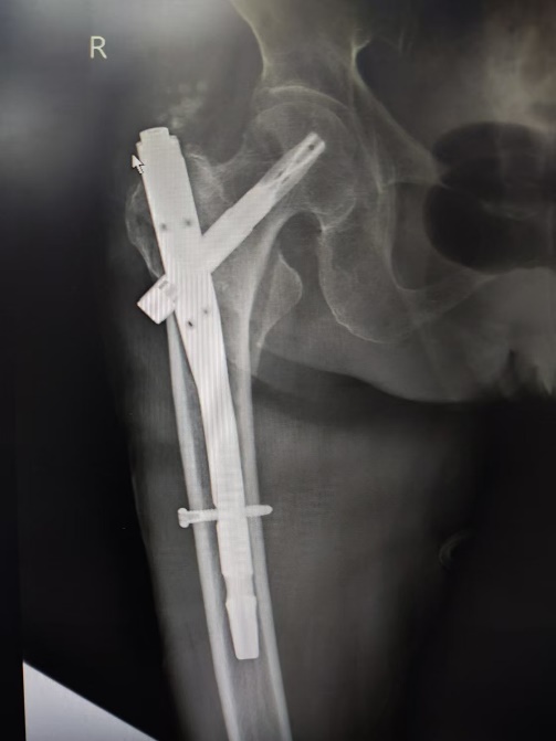 考虑患者手术的紧迫性,一旦错过手术时间窗,很难再有手术治疗机会,在多学科协作治疗下,医疗团队在患者入院第三天便为其进行了急诊手术。手术过程中,麻醉科吕建瑞主任主导,赵静医师全程保驾护航,在程斌主任指导下,薛建利副教授带领叶劲涛医师手术团队凭借其过硬的手术技艺,成功为患者实施了股骨粗隆间骨折髓内钉内固定术,骨折部位精准固定,手术损伤小,切口仅约6cm,术中出血仅约30毫升,整个手术过程流畅而高效,仅用时1小时。