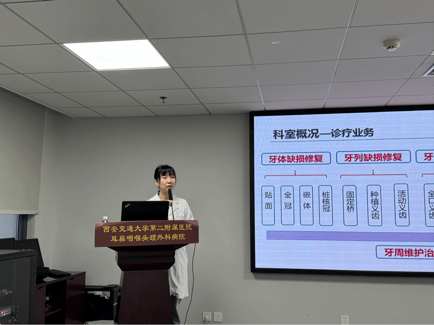 西安交通大学口腔医院数字化种植修复科党支部书记李蕴聪介绍了支部情况,杜良智主任和王方主治医师进行题为《上颌骨缺损的赝复体治疗》学术报告。三位老师等围绕上颌骨缺损序列化赝复体治疗的最新技术、数字化设计与制造流程、临床应用案例等方面进行了深入讲解,通过理论授课及病例分享等多种形式,让大家全面了解了赝复体修复技术的最新进展和临床应用前景。