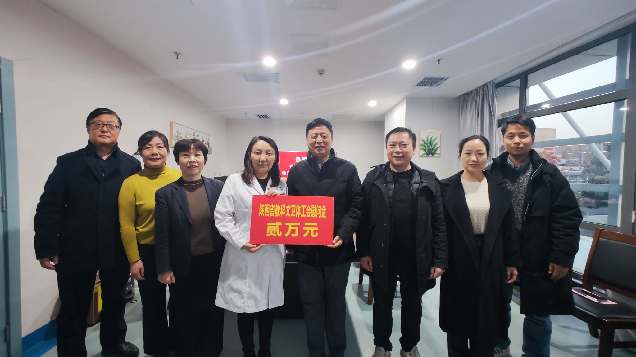 1月9日下午,陕西省教科文卫体工会主席徐富权,副主席夏明文、王薇,二级主任科员钟振宇一行四人莅临我院开展“送温暖”活动。我院党委书记刘昌、党委副书记党变玲、工会主席陈海文以及工会办公室相关人员陪同慰问。