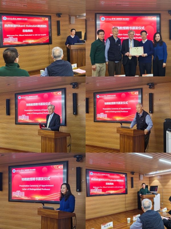 2025年1月7日下午,瑞典皇家科学院院士Rikard Holmdahl教授的续聘仪式在我院麻醉手术示教室举行。西安交通大学医学部吕社民教授、孟列素教授,我院种铁副院长、学科建设办公室纪泛扑主任以及Rikard Holmdahl教授团队部分成员参加了续聘仪式。会议由纪泛扑主任主持,我院部分青年学术骨干参加了此次会议。