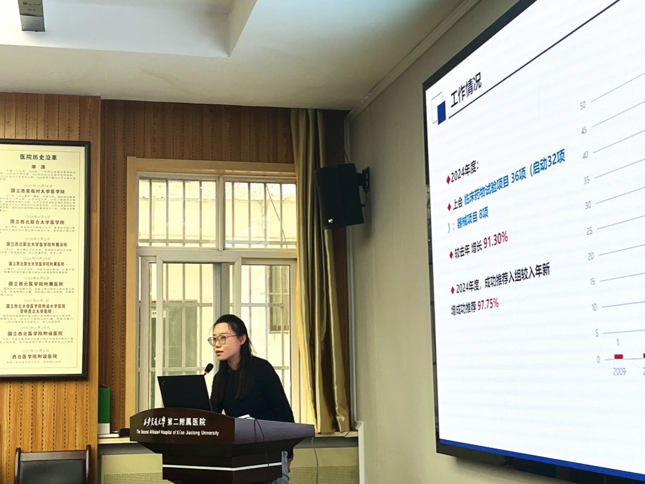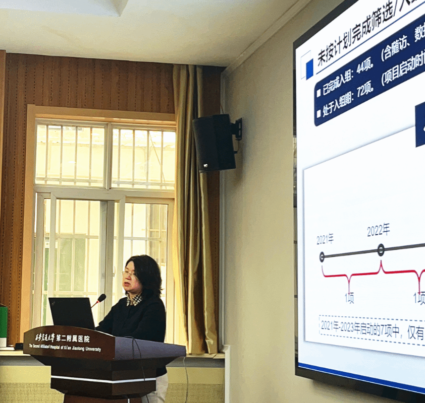 会议伊始,郭卉副院长发表了热情洋溢的致辞,对与会人员的到来表示欢迎,对全体临床研究人员在2024年临床试验工作中作出的成绩给予了肯定。她强调,临床试验项目质量及受试者入组率是保证临床试验高质量发展的核心,希望研究者认真思考、建言献策,为医院GCP高质量发展做出积极贡献。接着,郭卉副院长详细回顾了2024年度我院GCP工作进展和获得的成绩,结合合同经费与到账经费的差异、在研项目的受试者入组情况等内容,分析影响临床试验入组率的因素,结合实践经验提出了改进措施和建议,为我院临床试验未来的发展指明了方向。