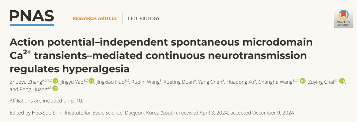 近日,西安交通大学第二附属医院神经内科特聘教授、科研副主任王昌河教授团队作为共同通讯作者在美国国家科学院院刊PNAS杂志( JCR1区/中科院一区 IF:9.58)发表了一篇题为“Action potential-independent spontaneous microdomain Ca2+ transients-mediated continuous neurotransmission regulates hyperalgesia”的最新研究成果。该研究发现外周感觉神经元中的瞬时受体电位通道TRPA1存在自发性的通道开放,介导细胞外的Ca2+向细胞内的自发流入并形成膜表面微域范围的Ca2+热点(spontaneous microdomain Ca2+ hotspot, smCa),通过cAMP-PKA信号通路触发感觉神经元胞体区和脊髓处中枢突触的持续性自发囊泡分泌来释放神经递质/调质。在慢性疼痛病理过程中,“TRPA1➝smCa钙热点➝PKA➝自发囊泡分泌”通路得到显著增强,而抑制该通路的各环节能有效缓解慢性疼痛病理下的痛敏反应,提示其可能在慢性疼痛的发生和发展过程中发挥重要调控功能,该研究有望为慢性疼痛的临床治疗提供新的理论指导和药物靶点。本研究得到中国自然科学基金、中国博士后科学基金、陕西省科学基金和陕西省博士后科学基金等项目的支持。
