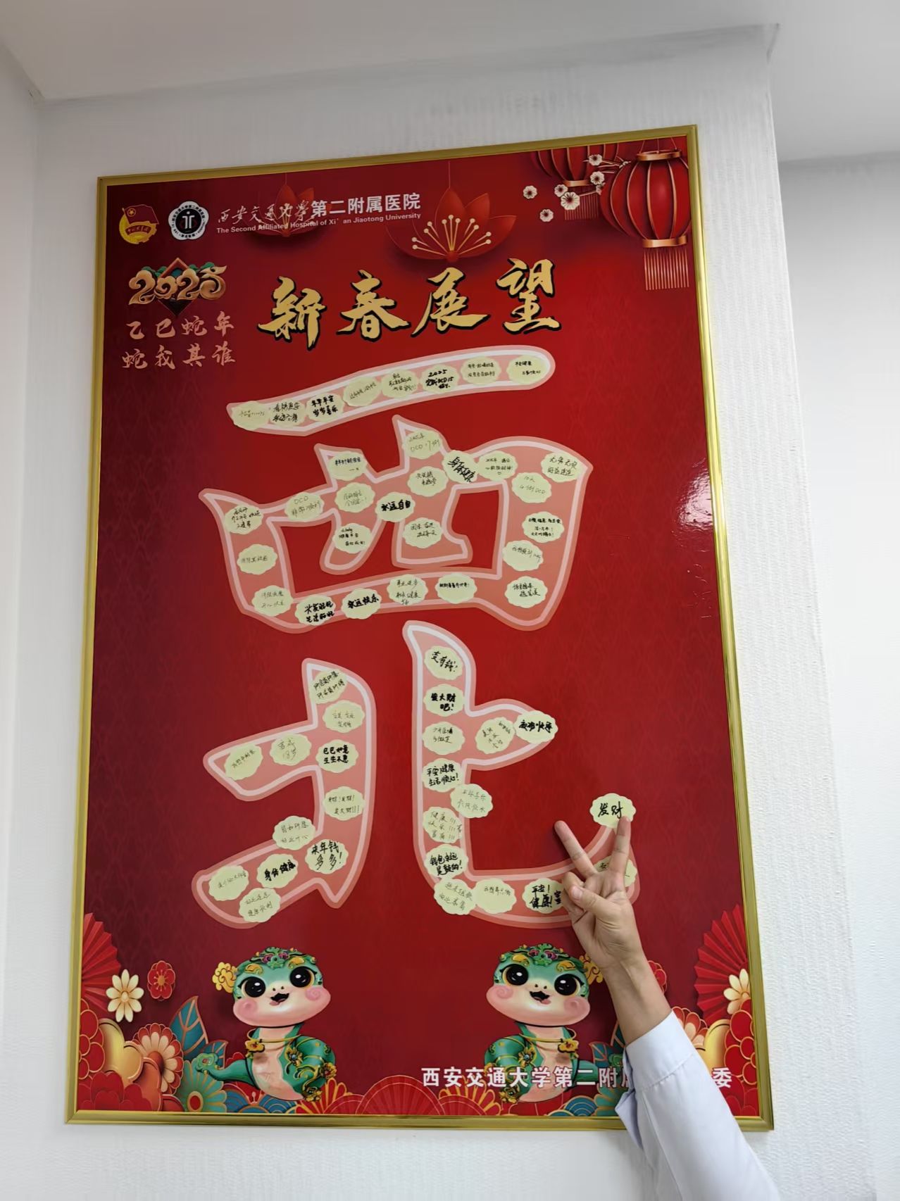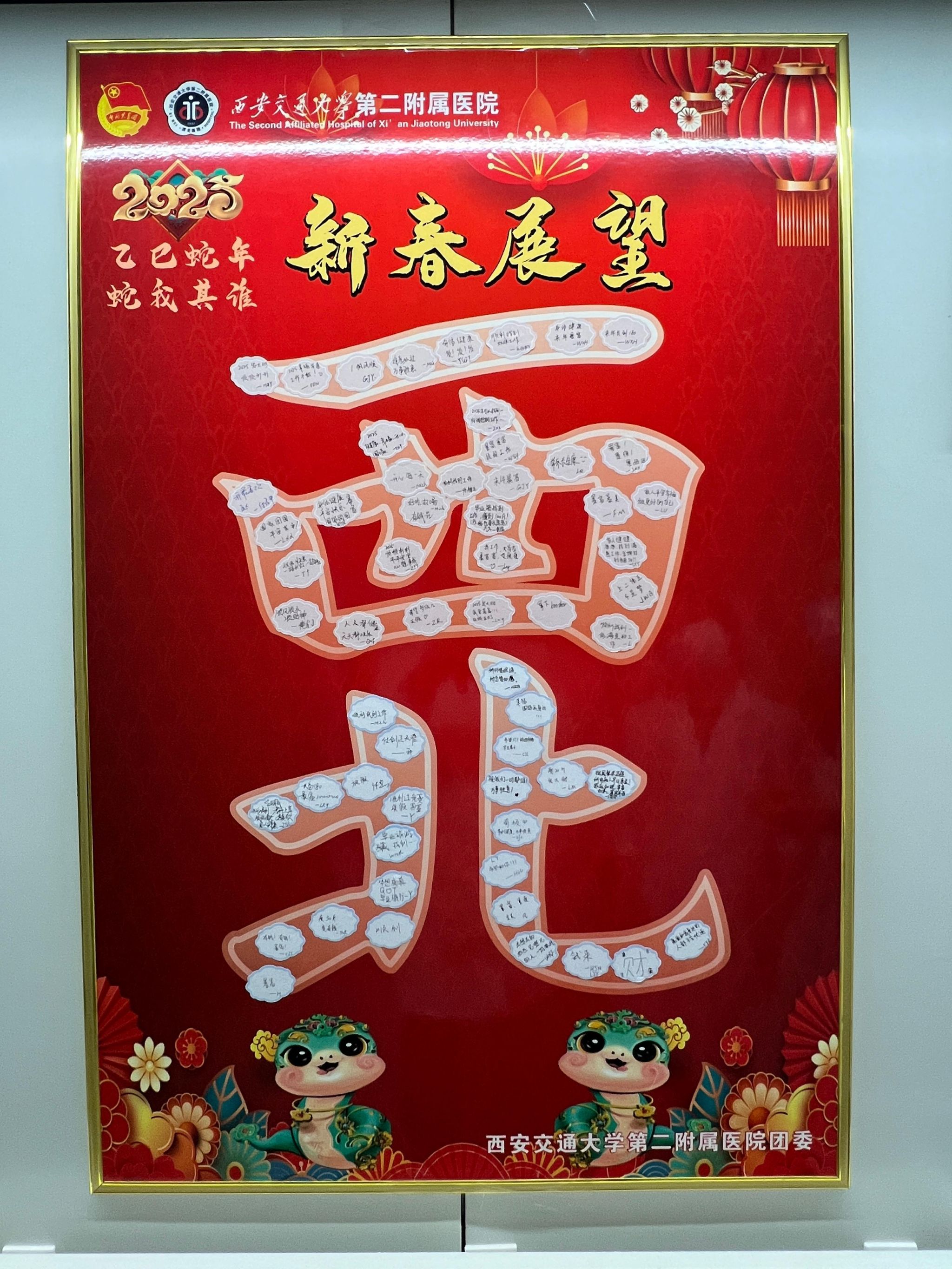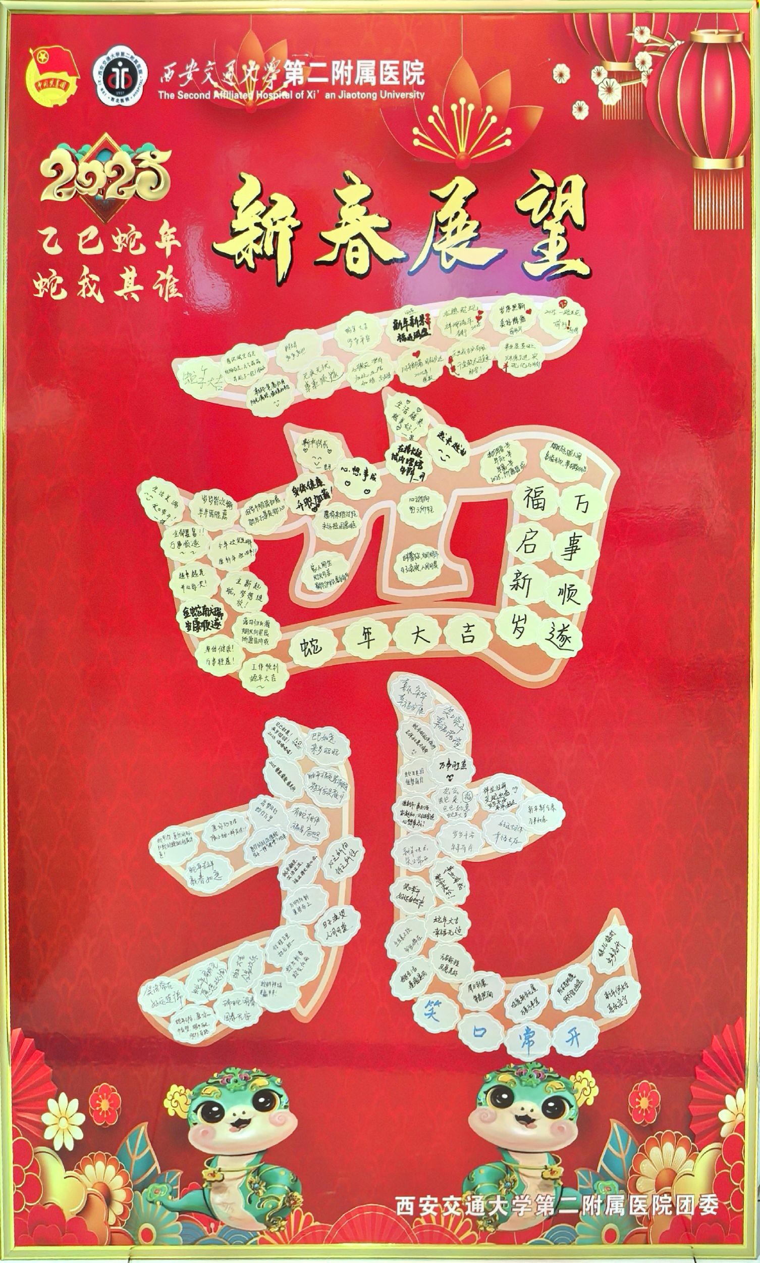蛇年将至,院团委开展2025年“巳巳如意”青春展望活动。院团委专门设计出寓意吉祥和“西北”字样的展板和异形贴。在全院各团总支书记、各团支部书记的组织号召下,全院团员青年纷纷在贴纸上写下了自己的新年期许和对未来的美好祝愿。