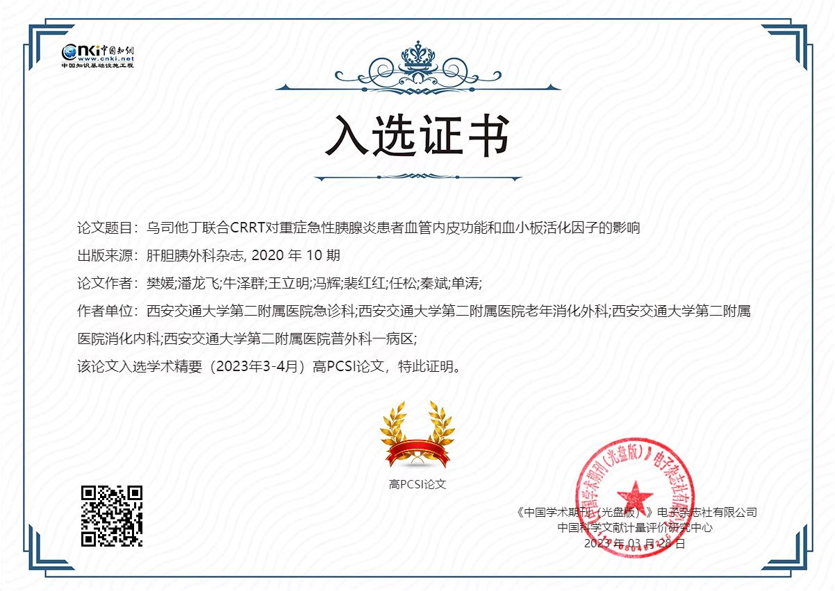 《乌司他丁联合CRRT对重症急性胰腺炎患者血管内皮功能和血小板活化因子的影响》,2020年10月发表于《肝胆胰外科杂志》,PCSI指数11.854,位列消化系统疾病前1%(57/12397)。