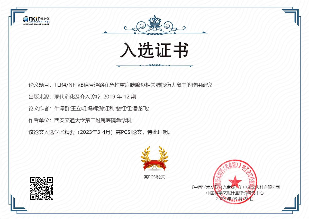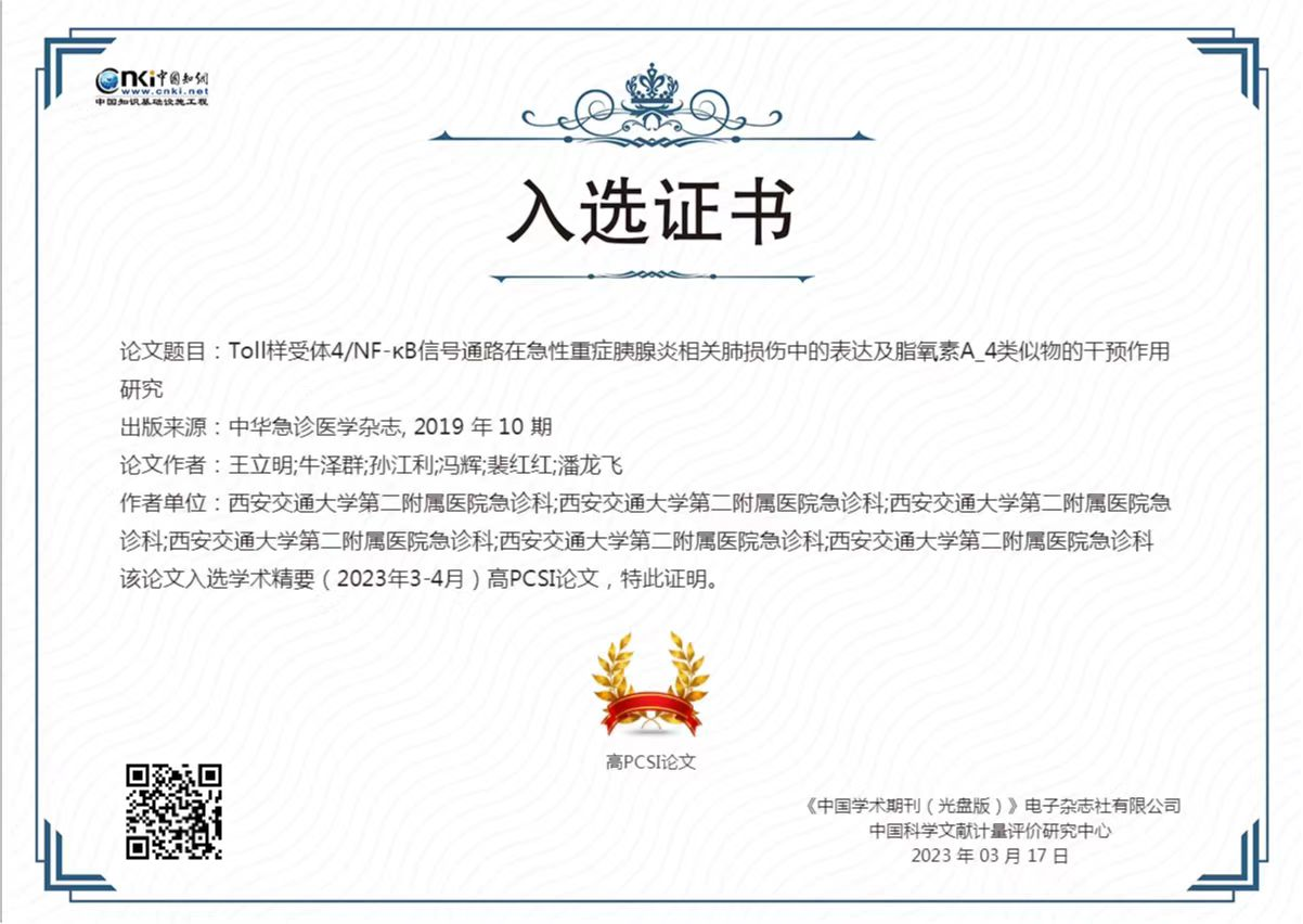 《Toll样受体4/NF-kB信号通路在急性重症胰腺炎相关肺损伤中的表达及脂氧素A—4类似物的干预作用研究》,2019年10月发表于《中华急诊医学杂志》,PCSI指数9.201,位列消化系统疾病前1%(106/16256)。