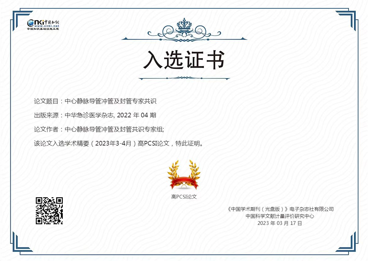 《中心静脉导管冲管及封管专家共识》,2022年4月发表于《中华急诊医学杂志》,PCSI指数4.701,位列临床医学前1%(11/2364)。